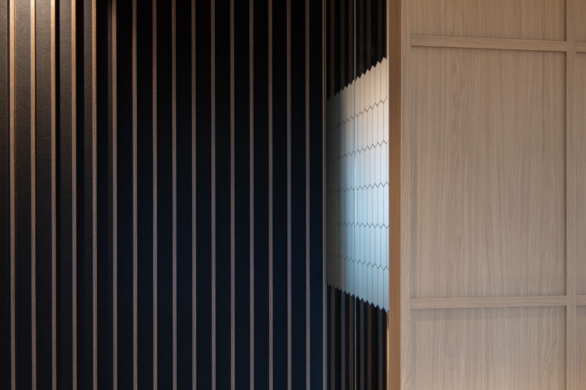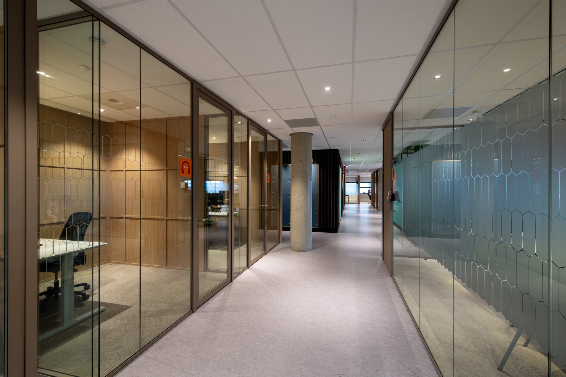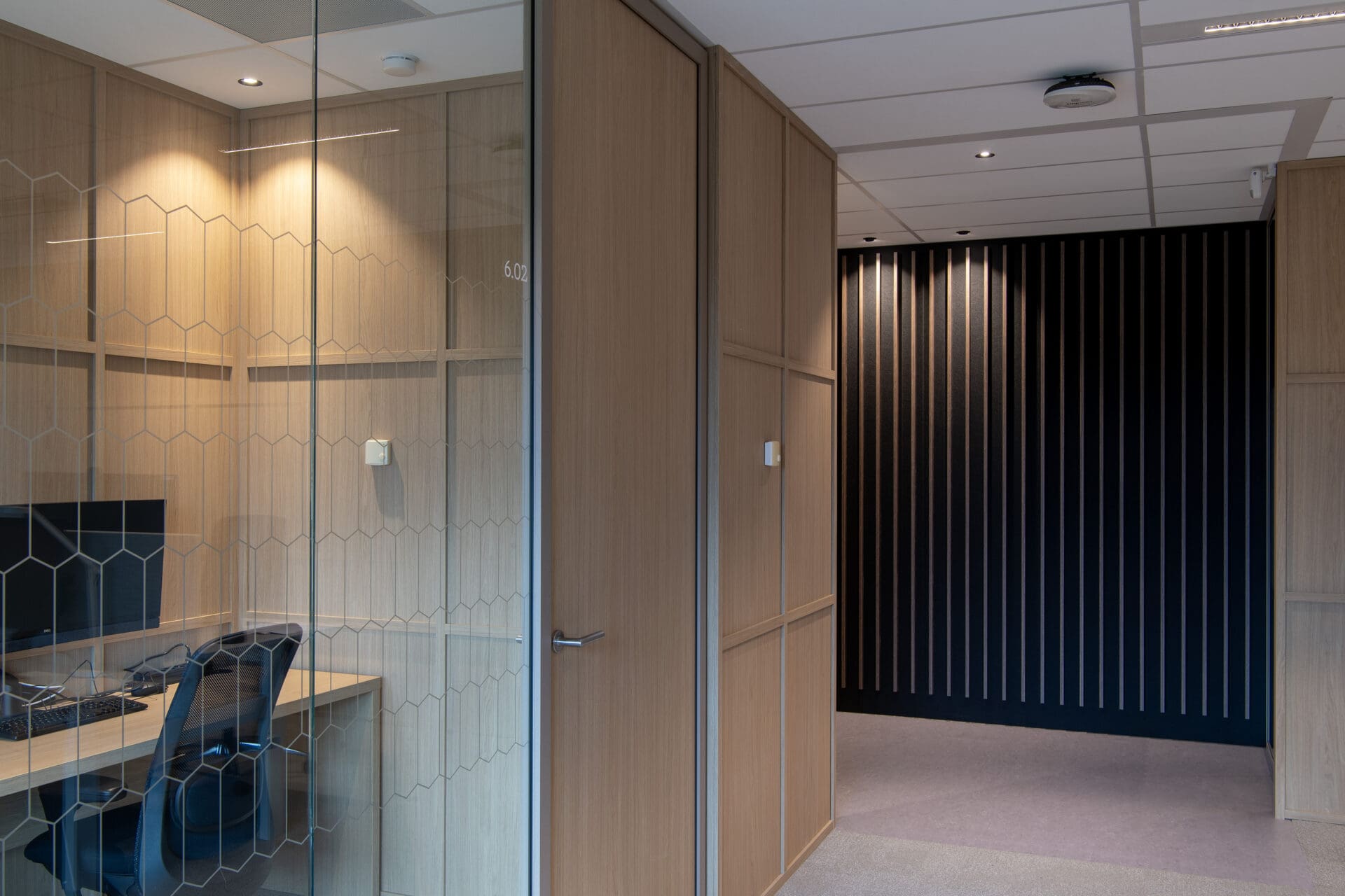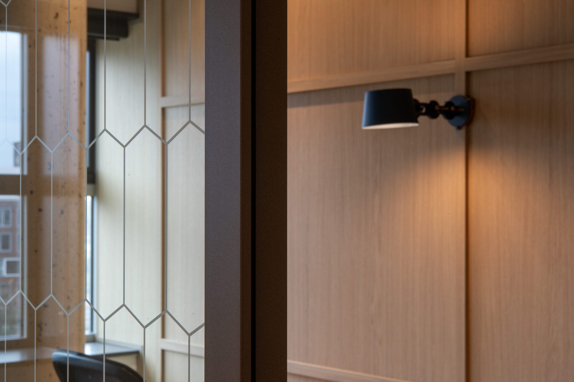 Diese Bewegung spiegelt sich auch in der Materialisierung wider. Vor allem die geschlossenen Holzwände spielen dabei eine zentrale Rolle. Sie bilden ein maßgefertigtes Basis-Trennwandsystem mit Holzrahmen, das sich nahtlos in das Interior-Konzept einfügt. Der Holzton passt zur nachhaltigen Identität der ASN Bank. Francis: „Die Muster im Holz sorgen für Ruhe und Wiedererkennbarkeit. Sie verbinden die Räume miteinander.“