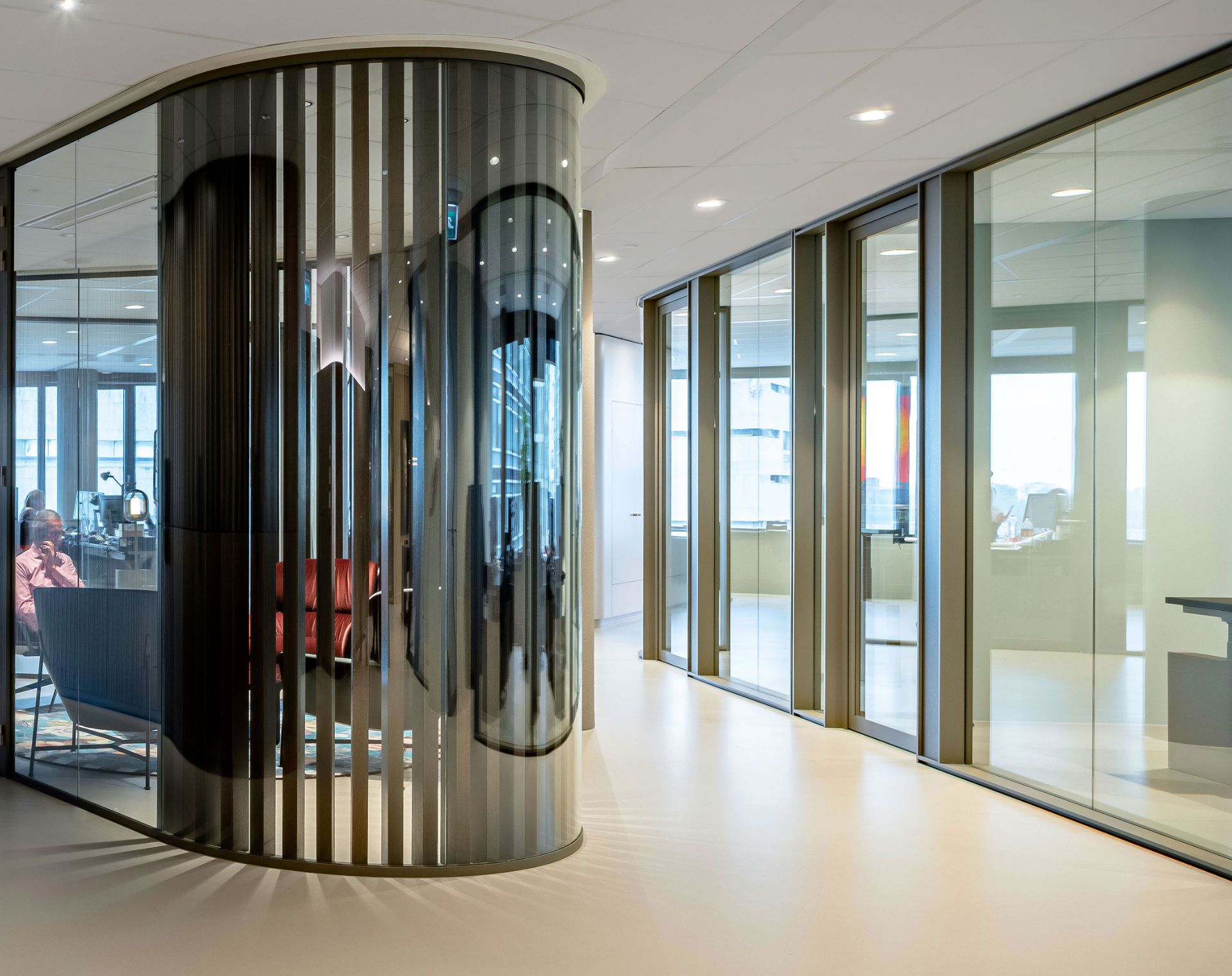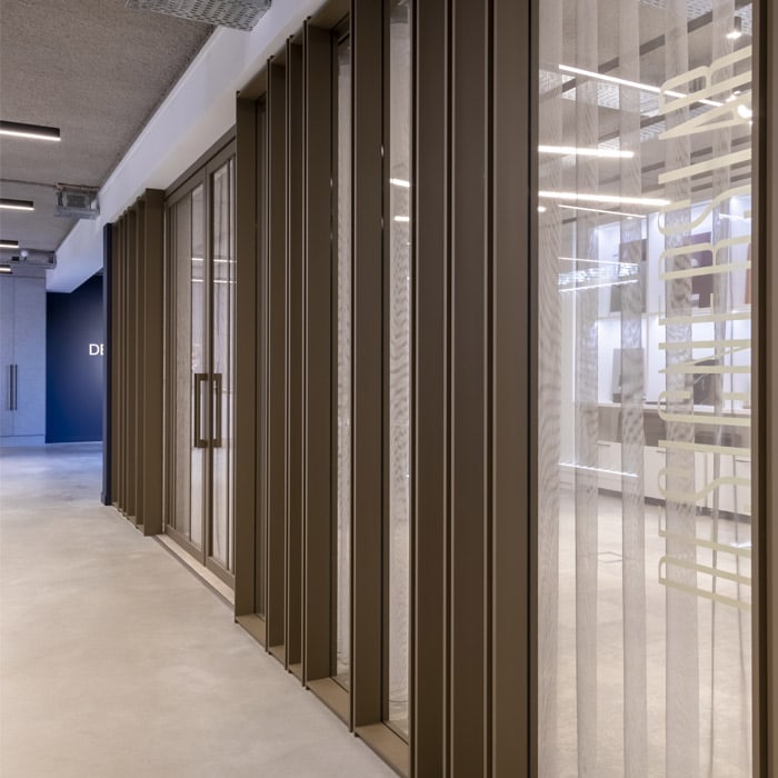 Für zusätzliche Privatsphäre kann SKYE mit mattem oder farbigem Glas ausgeführt werden. Dadurch fügt sich SKYE in jede Büroumgebung ein, in der Ästhetik, Transparenz und maßgeschneiderte Lösungen im Mittelpunkt stehen.
