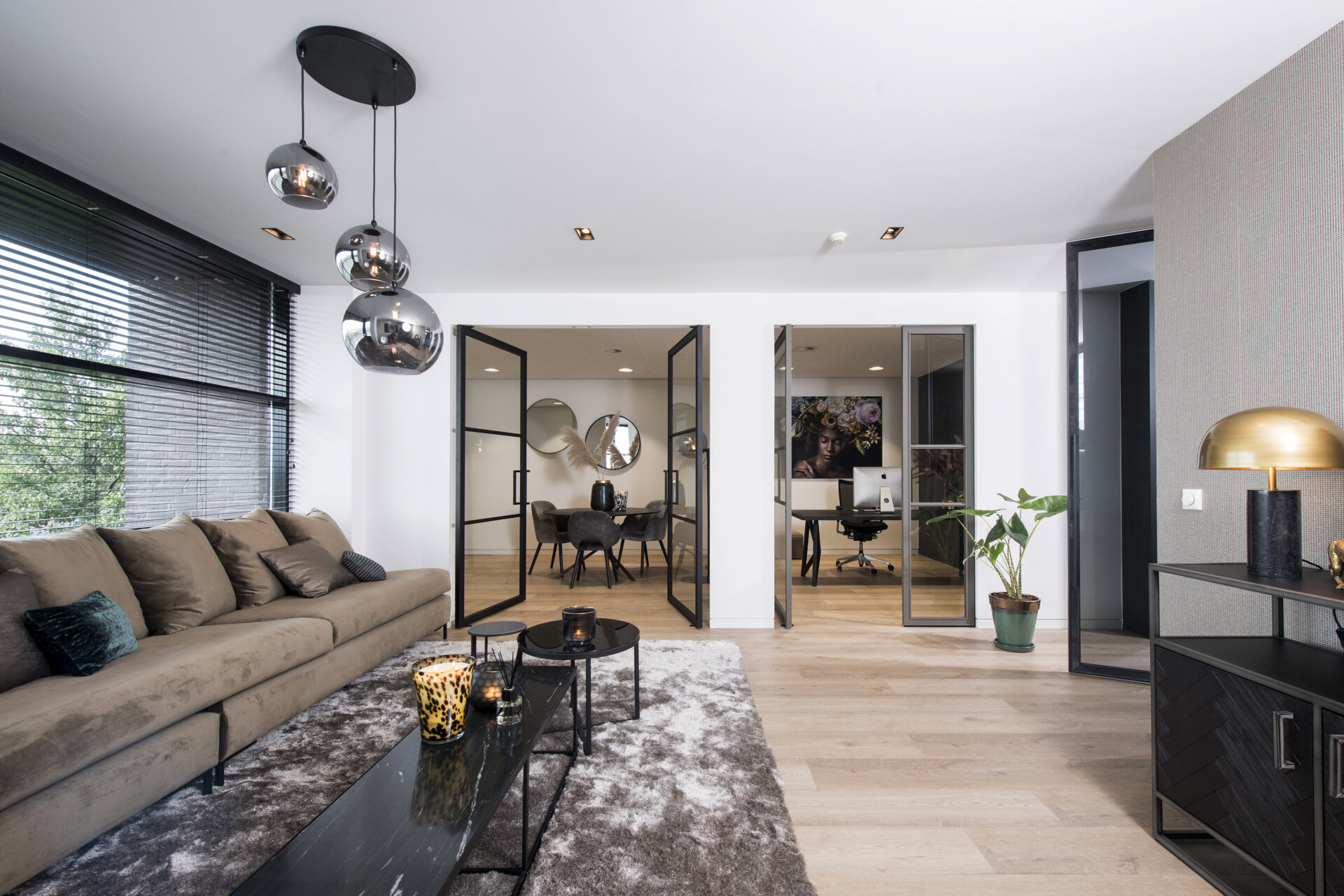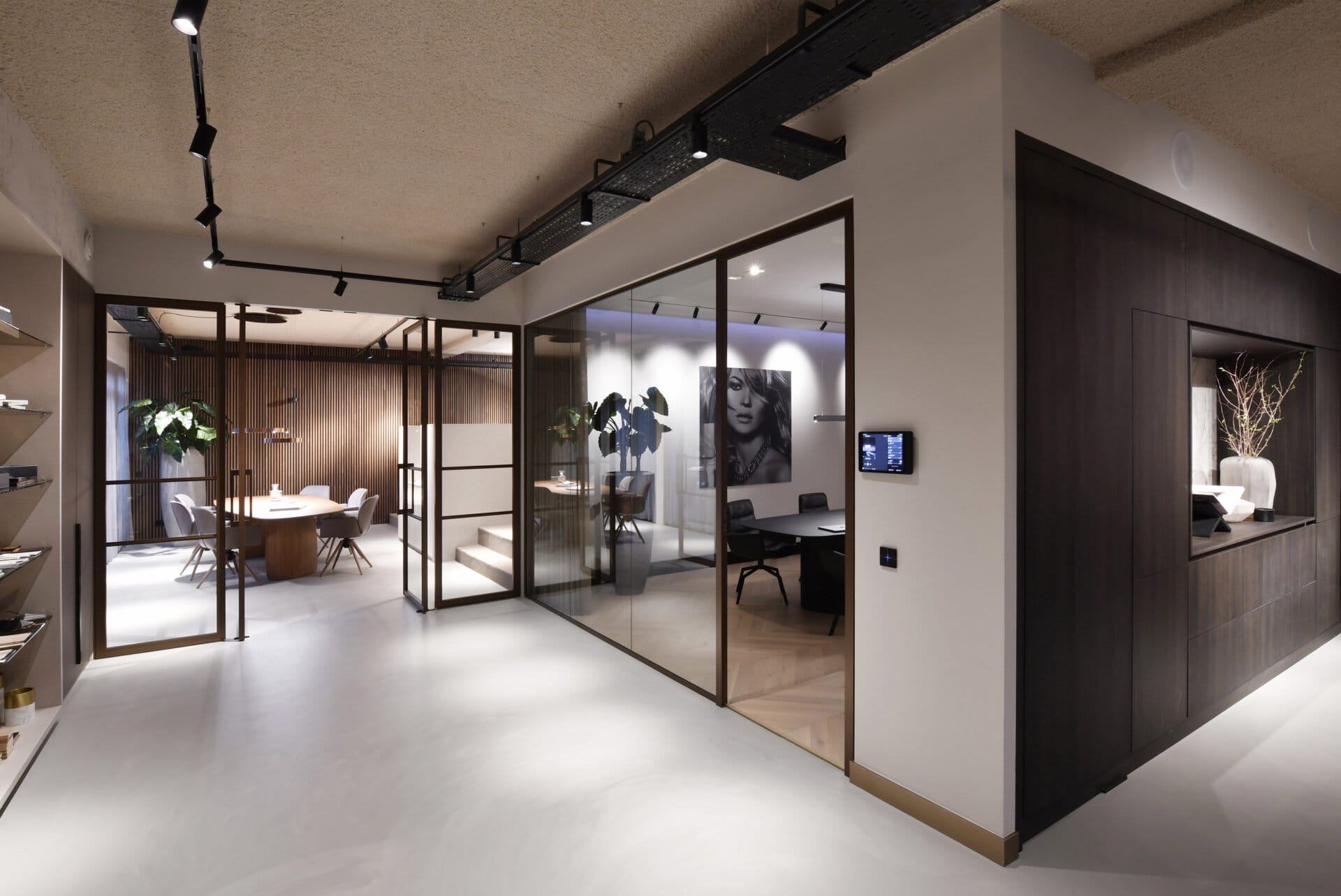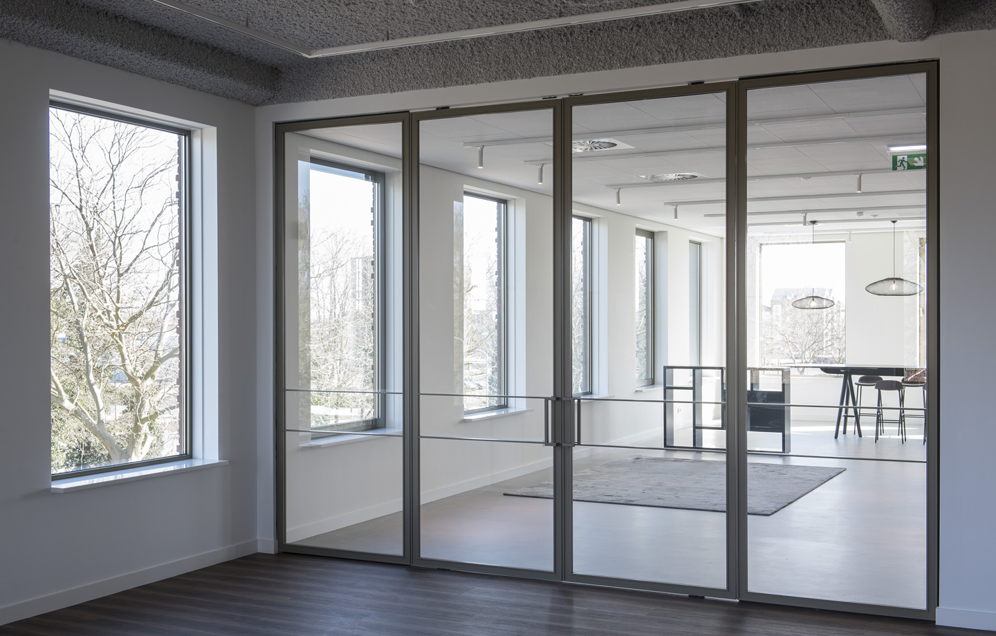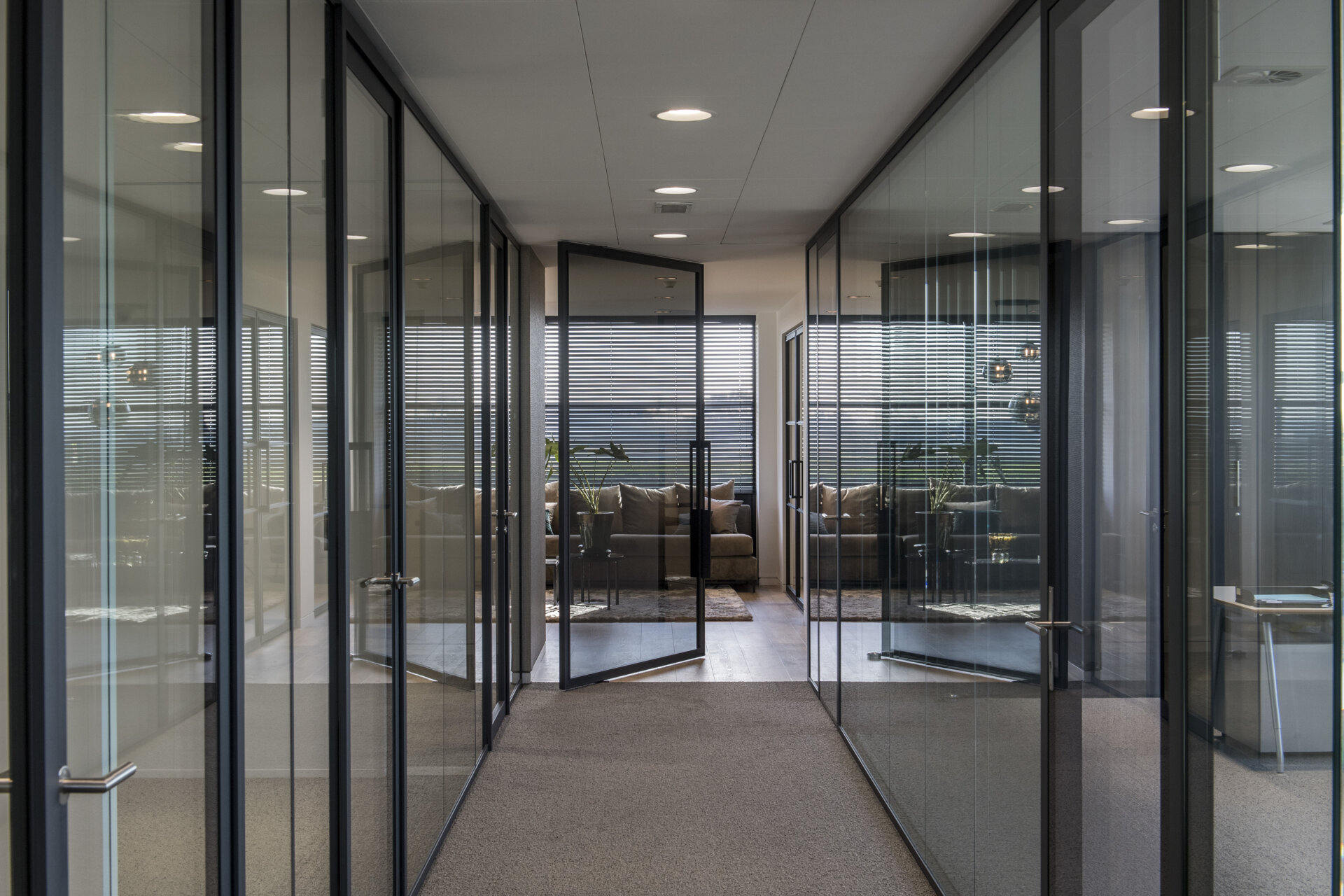 Die Pivot-Tür fügt sich nahtlos in unsere Glaswandsysteme ein und verstärkt die wohnliche Atmosphäre in der Büro umgebung. Das Ergebnis ist ein heller, offener und komfortabler Arbeitsplatz, der zum Zusammenarbeiten einlädt.