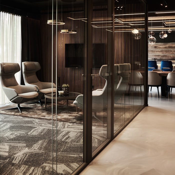 Das 700 m² große Büro von Goedkopekoffiebekers.nl (GKB) & TakeAware – Friendly Disposables ist ausgestattet mit hochwertigem maßgefertigtem Innenausbau, mehreren informellen Lounges, einem Großraumbüro mit eigener Pantry, drei Direktionsbüros, Telefonboxen, zwei großzügigen Besprechungsräumen und einem Café für die besten After-Work-Momente. Die Räume werden durch akustische Glaswände voneinander getrennt. So entsteht eine informelle und offene Arbeitsumgebung, in der dennoch in absoluter Ruhe gearbeitet werden kann.